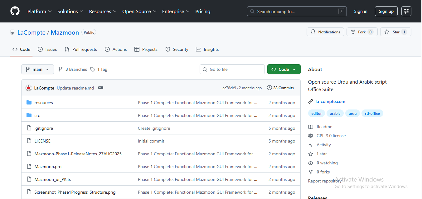 Mazmoon (نومضم) is a project of La Compte that is a GNU 3.0 Open Source Licensed endeavor focusing towards developing an open source Urdu Language Office Suite. It is meant to address the issues which are ongoing because of the use of InPage at National Level in Pakistan – a software which is currently being run through piracy or through outdated technology and has been noted to have incompatible cross-program conversion because of limited embedded glyph transfer. This project will utilize already established office suites that are open source and adapt them according to the requirements of the Urdu language utilizing community – business, government and business – as an open source alternative that is Pakistan built, Pakistan maintained, and Pakistan focused. This project is meant to be Pakistan first.